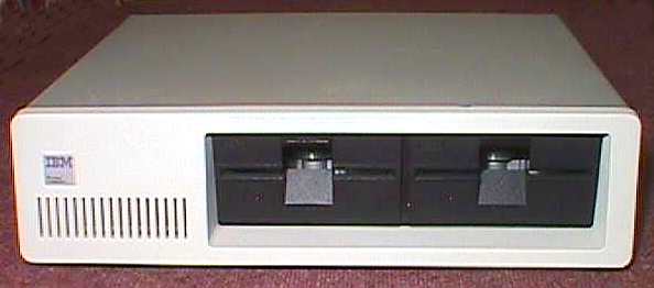 The front of the "system unit" contains some vent holes for cooling and two full-height drive slots. Typically the early 5150s came with a single 5.25" floppy disk drives (the left-hand bay would have been filled with a black blanking plate). These were frequently upgraded later to support dual 5.25" floppy drives or a 10 MB hard disk.