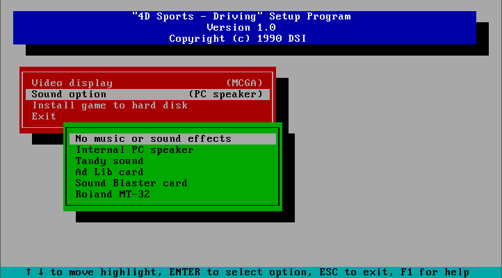 "4D Sports - Driving is best played in MCGA mode, which provides 256 colours (though it doesn't use a full colour palette, it's still slightly better than EGA). Sound Blaster audio is the best option for music and sound effects, and the game will run at a decent frame rate if you have a 386DX-16 or faster. Having a mouse driver loaded will make menu navigation easier in the replay mode and track editor. While racing, the keys work just fine, but I find a decent-quality arcade analogue joystick with a short stick is best. Switch off the music using CTRL-M if it gets annoying."