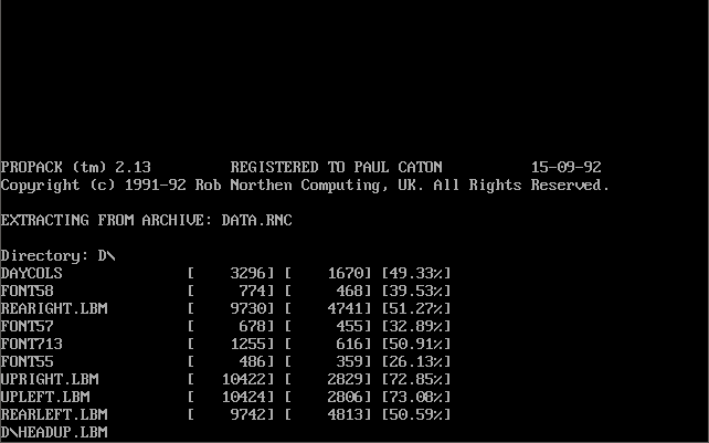 | 1.1 | January 1993 | Updated INSTALL utility. Just as with the earlier INSTALL.EXE, you can use subst to make a hard disk directory mimic drive A: then run INSTALL from A: in situations where you have all the game files from floppy disks already in a directory. Screenshots: 1 2 3 4 5 6 |