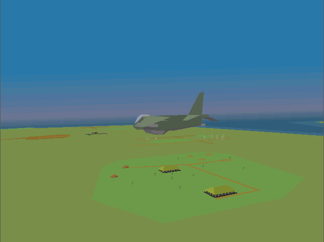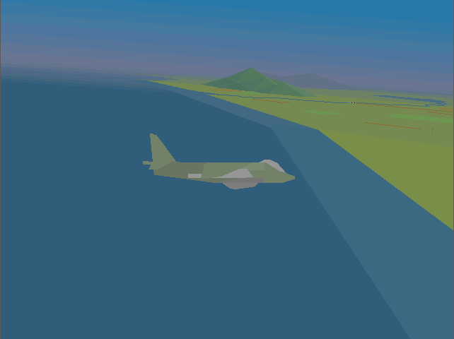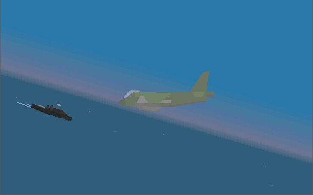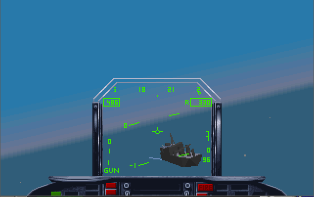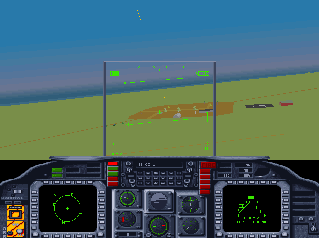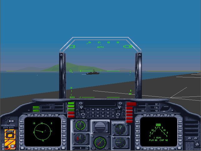 The in-flight graphics are pretty sparse when compared to MicroProse flight sims such as F-15 Strike Eagle III (1992) or F-117A Nighthawk: Stealth Fighter 2.0 (1991). The landscape here is mostly just one or two colours, there's not much 'scenery' to see (just the island of East Timor is available to you), aside from some small hills, mountains, and military sites which have a handful of buildings and a SAM site to target. The gradiented sky looks good though, and lends some forgiveness for the sparse landscape.
