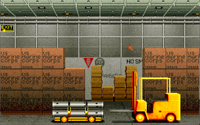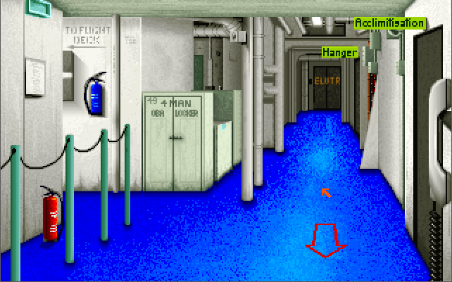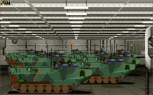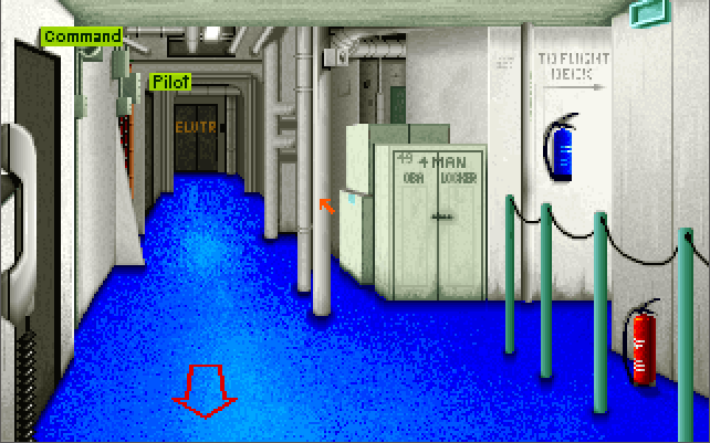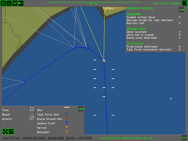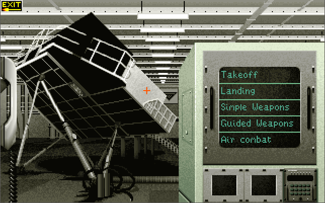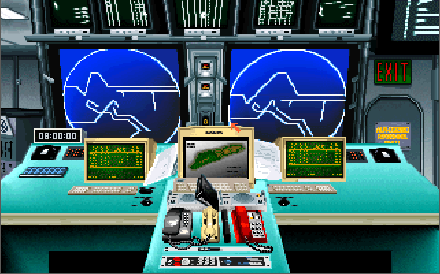The menus and the strategic game all require a pointing device (either a mouse or joystick), while in-flight you also have the option of using keys only. You start the game in the Command Center. If you are wanting to get airborne, click on the white telephone to go to the Pilot's Briefing Room. Listed on the whiteboard are the missions available to fly. The "Combat Air Patrol" is always available whenever a Harrier is available on the deck.