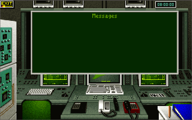 Return to the Command Centre screen (the one with the screens and telephones), and hit ESC. When prompted 'EXIT TO DOS (Y/N)?' just hit 'Y'.