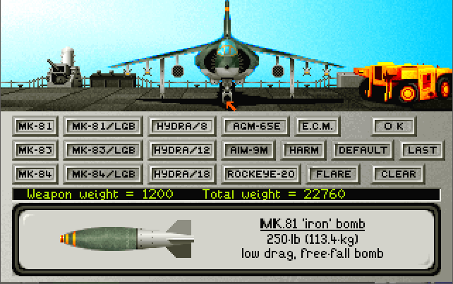 The next issue I had was arming the aircraft. There is no way of recognising what weapon is currently loaded until you have gone through all of them to learn what they look like. Simply hovering your cursor over a loaded weapon should ideally have some indicator to let you know what it is. I know, I'm being lazy, but it's better than having to remove the weapon, find the one that looks the same in shape and colour and putting it back on. Fortunately, there are only really about 8 different types of ordnance you can fit, so with some trial-and-error you do get to learn what's what - by why make it that hard for someone just starting out with the game? On the plus side, each mission starts with what the armourers consider to be the right payload for the mission ahead, so you do have the choice to just go with that if you like, and I like the fact that if you need to re-do the same mission, a quick click on 'Last' loads up that set of ordnance you had on the previous sortie.