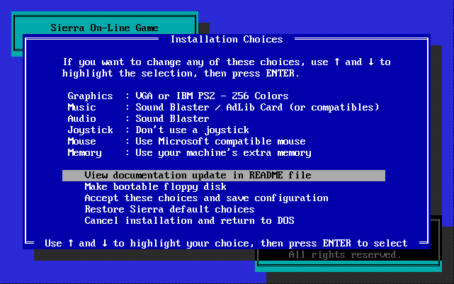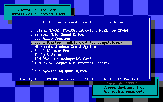 To configure the game for your hardware, run the provided INSTALL.EXE utility. You have the following options: