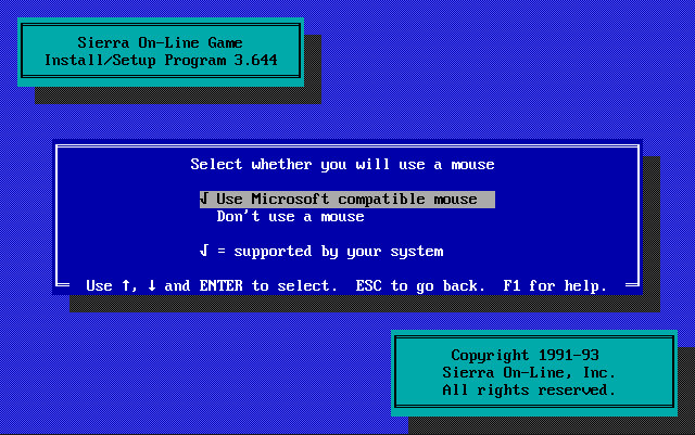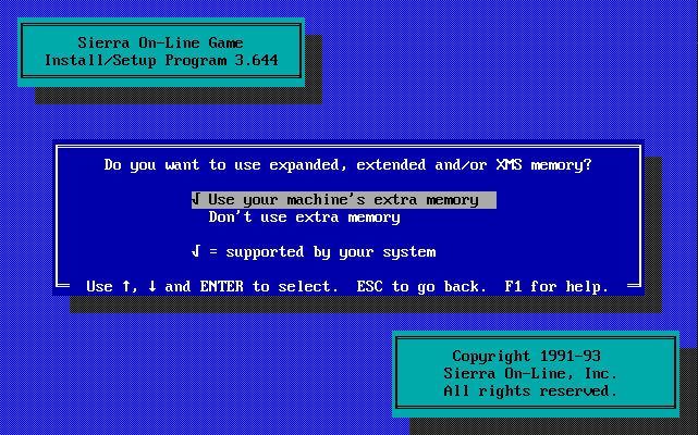 If installing in Windows (DOS is recommended by Sierra!), the game will not run properly if your video is set to a 24-bit colour depth (64,000 colours) or True Color mode (1.6M colours). Use a 256-colour mode.