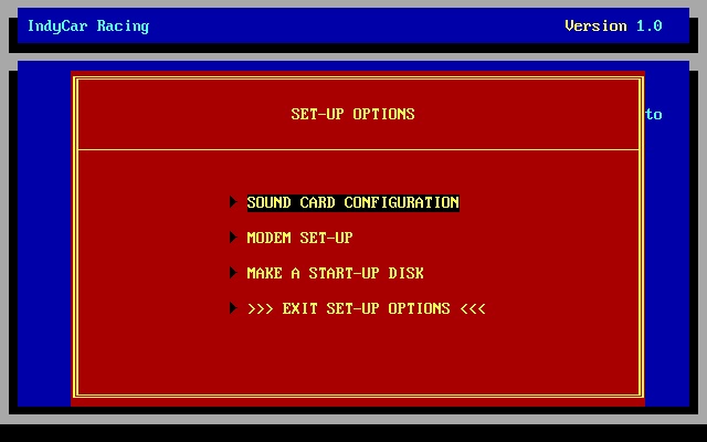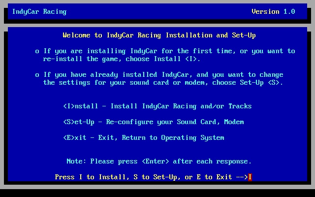 IndyCar Racing must be installed to a hard disk - it cannot be run directly from floppy disks or CD-ROM. Once installed, go to the game directory and type INDYCAR to run it, or INSTALL to reconfigure your sound and modem settings.