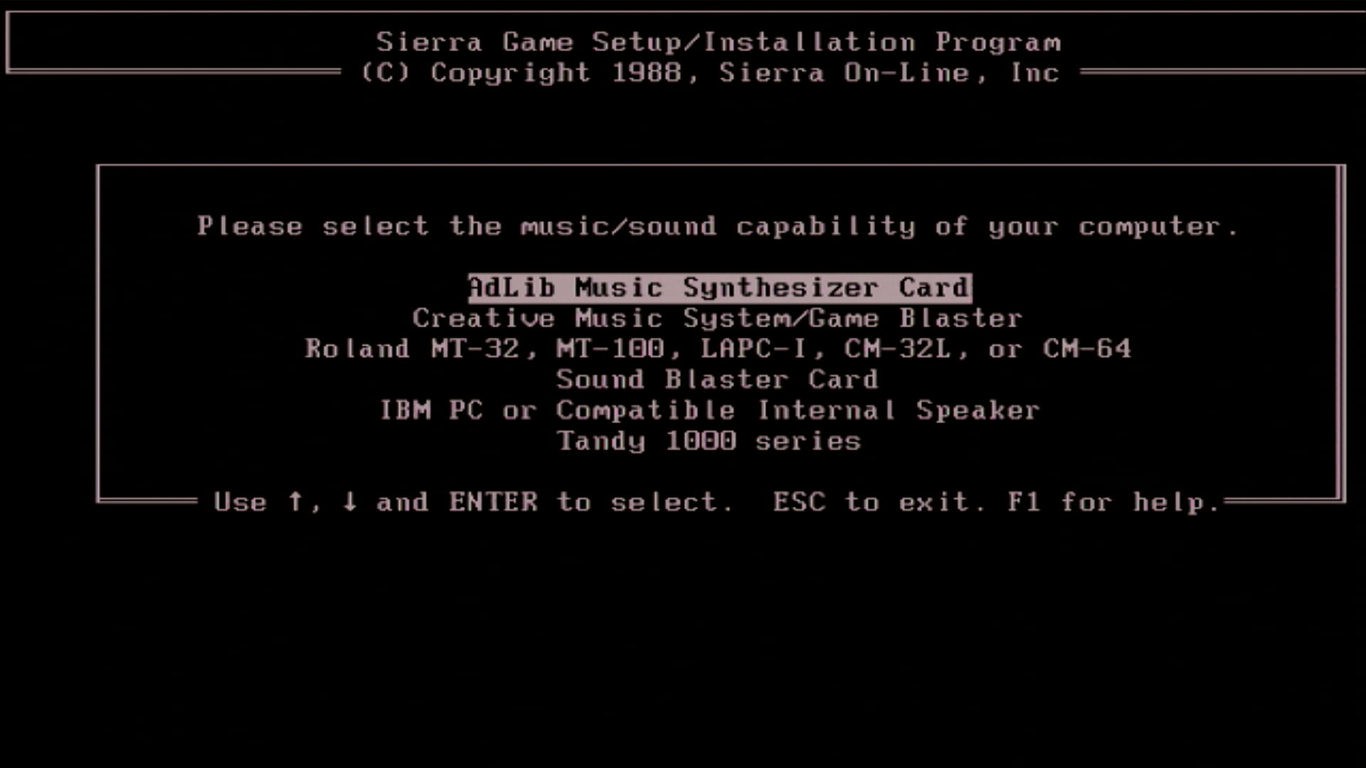 Audio support for Tandy/PCjr, Ad Lib, CMS/Game Blaster, Sound Blaster, and Roland MT-32/LAPC-I.