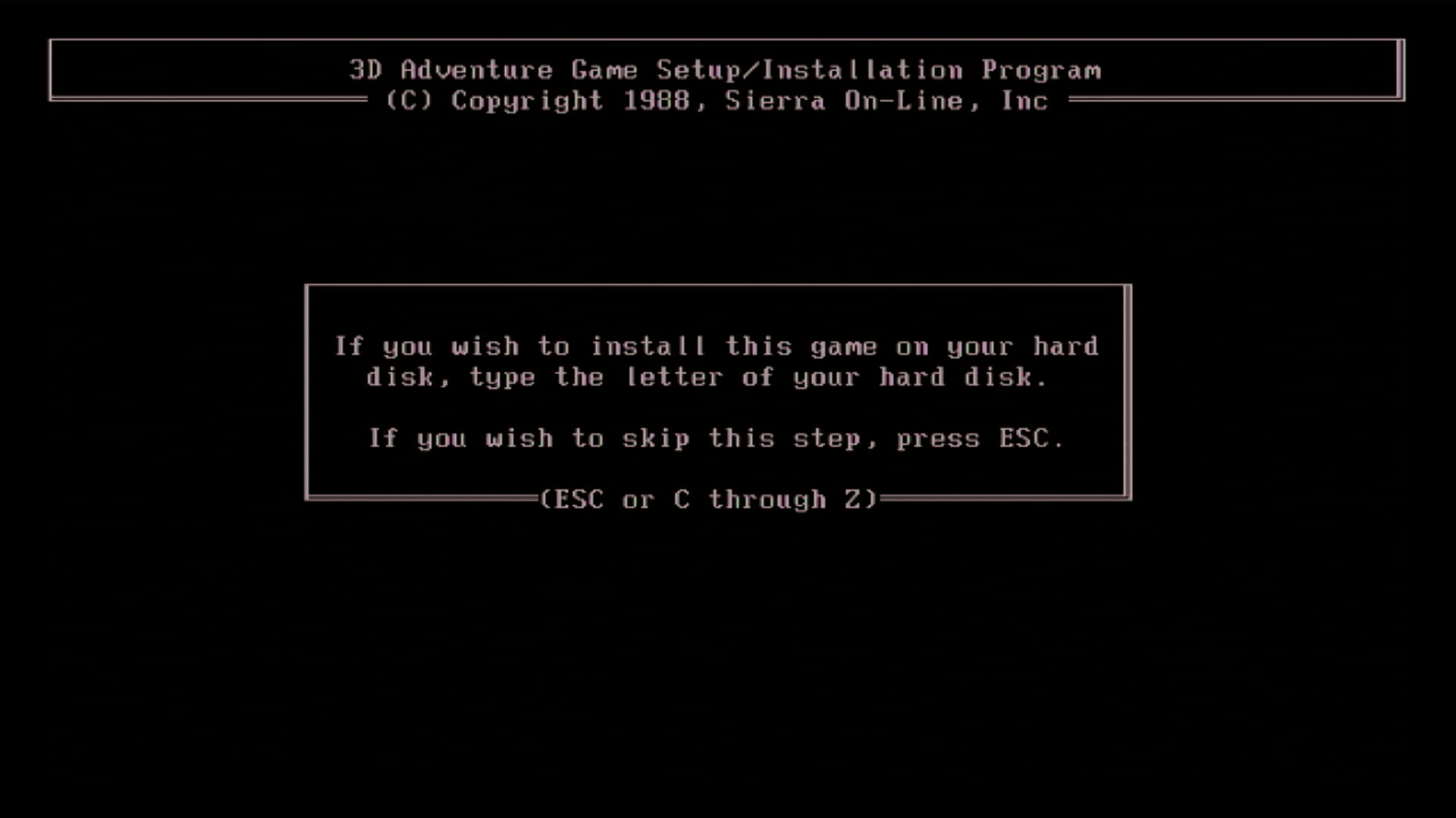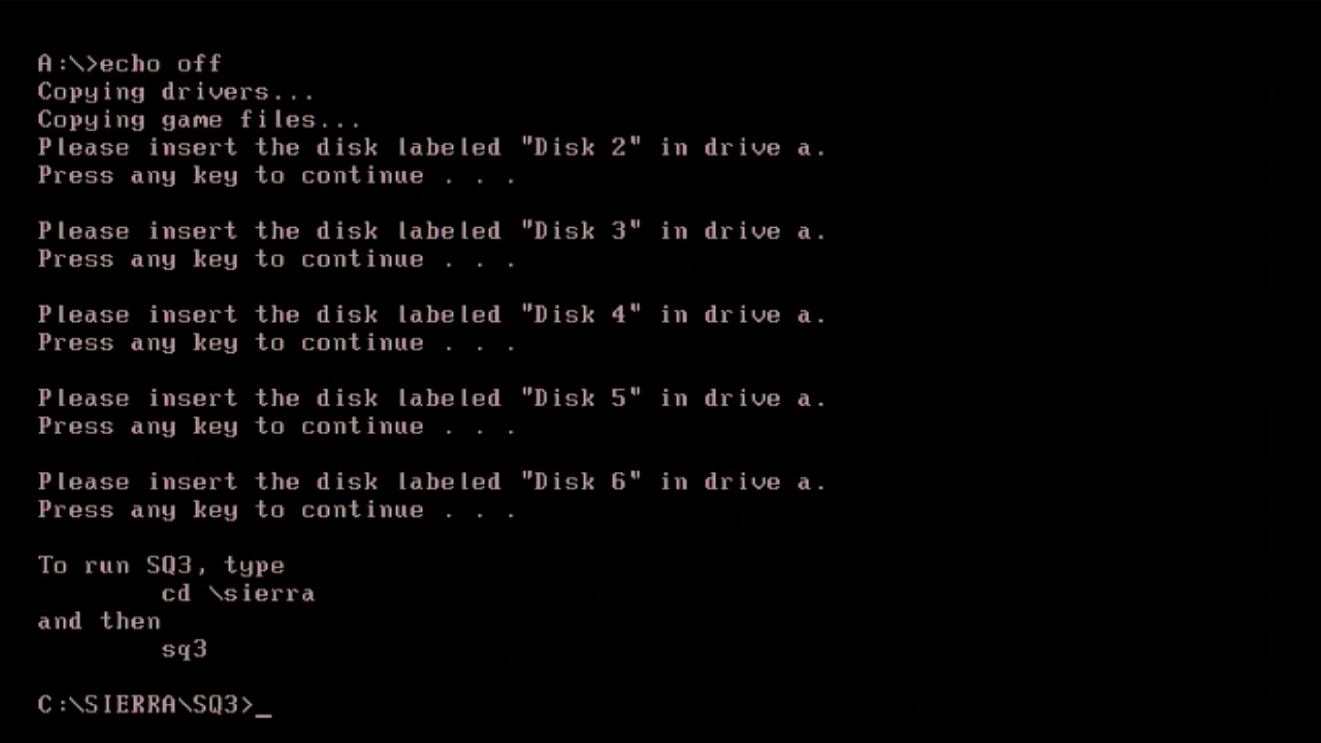 If running the game from floppy disk, insert disk 1, type SIERRA and press ENTER. If running the game after installing to your hard disk, go to the game directory and run SQ3.BAT.