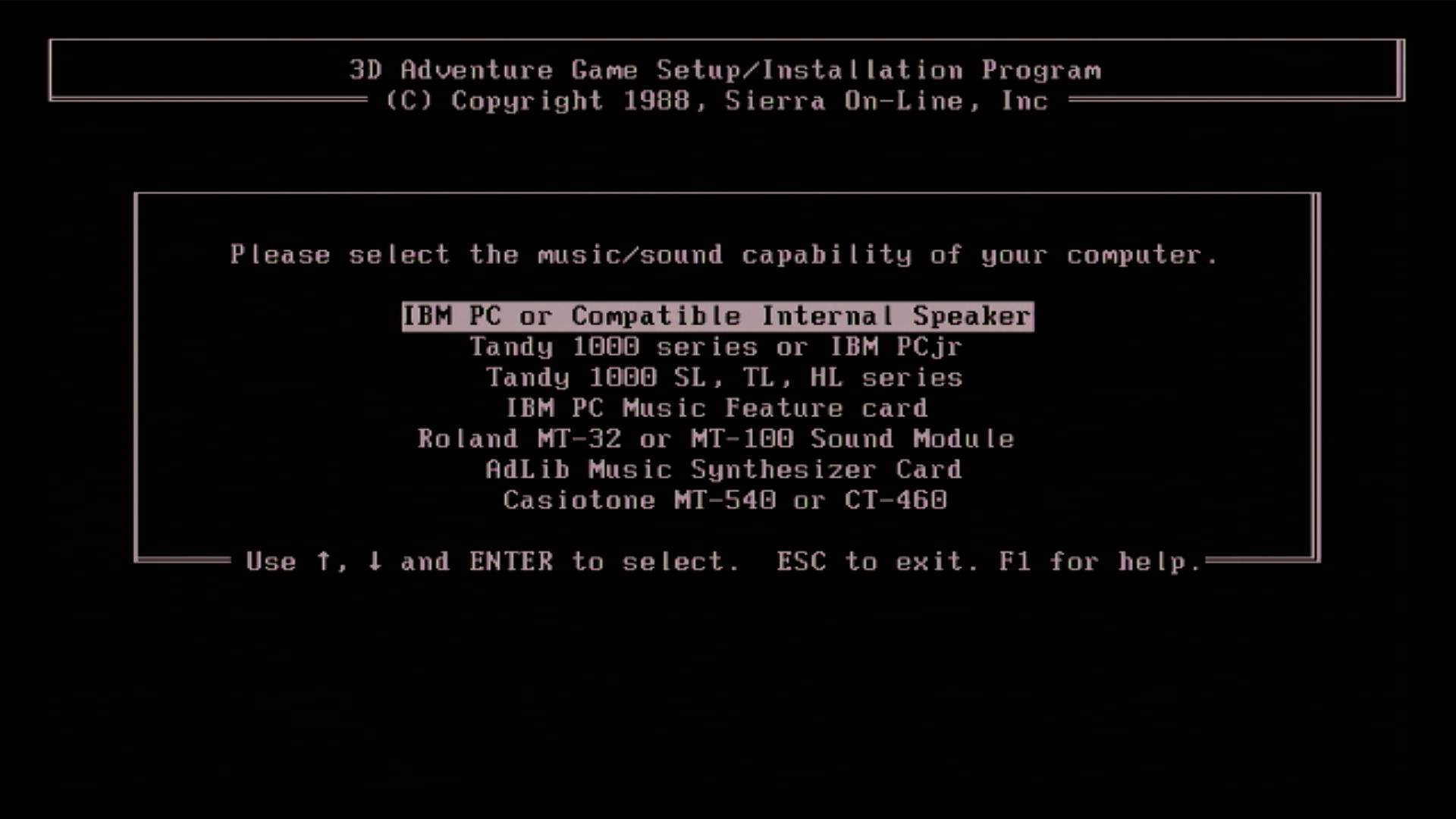 Audio support for PC Speaker, Game Blaster, IBM Music Feature Card, Tandy DAC (TL/SL-series), Tandy/PCjr, Ad Lib, Sound Blaster, or Roland MT-32/LAPC-I.