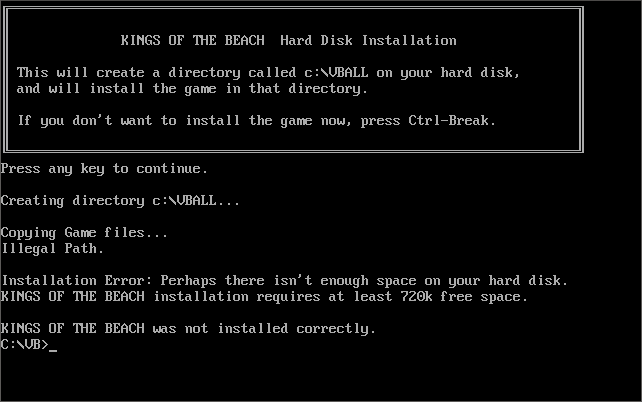 To install Kings of the Beach to your hard disk, insert GAME DISK 1 and run the INSTALL.BAT file with a single argument that denotes the hard disk drive letter to install to, e.g.