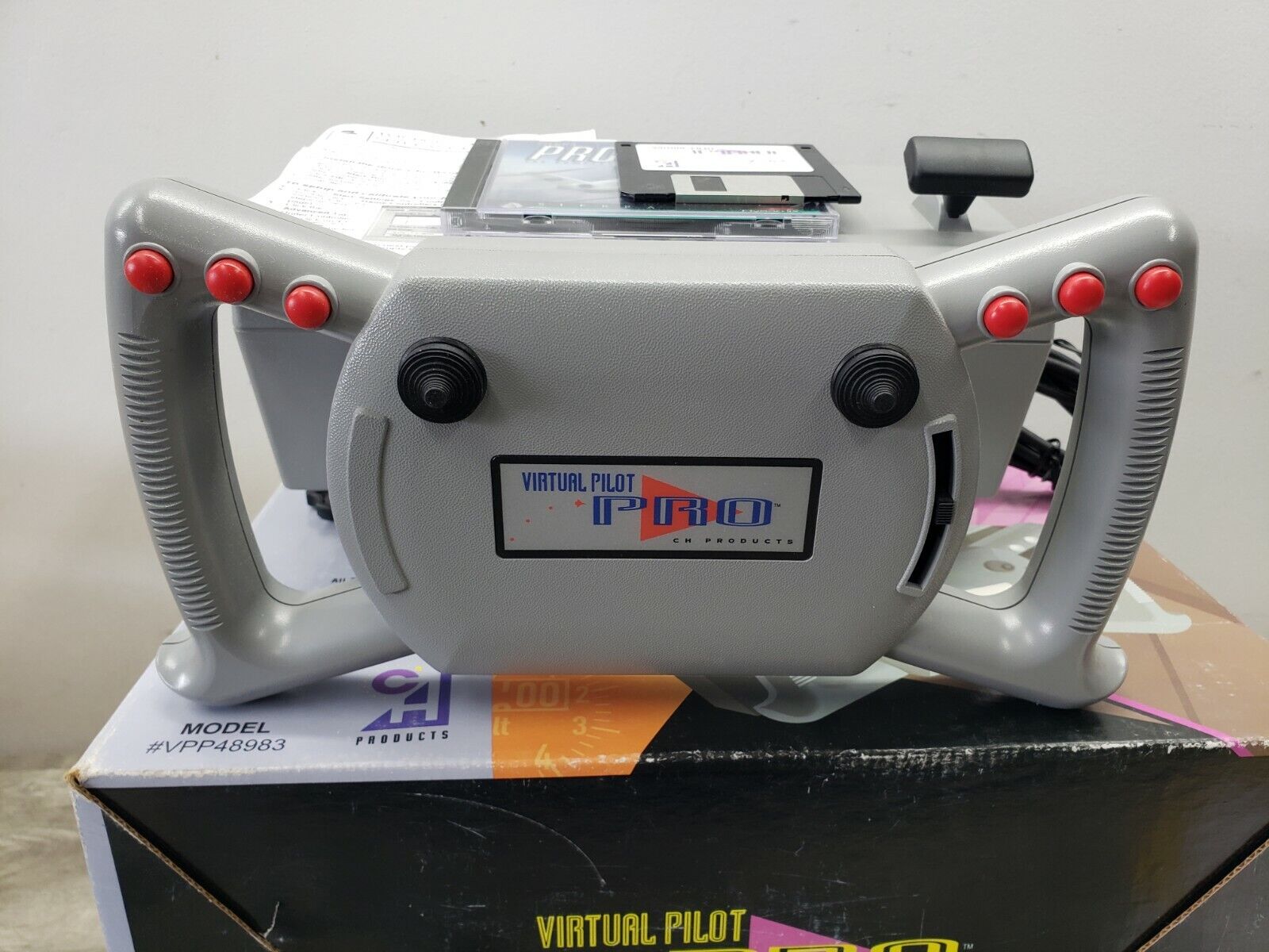 " You may remember a product that came out of CH Products a couple years back called the Virtual Pilot. It was a flight yoke with two fire buttons, trim controls, and a throttle. It was state of the art when it appeared, and it sold in droves to those folks whose be all and end all was computer-aided flying. Meet its technological offspring, the Virtual Pilot Pro. The throttle and trim controls still adorn the yoke, but CH Products has added four more fire buttons, as well as two four-way hat switches. The unit clamps to your desk by way of two screw-down plastic feet (note that the maximum spread for clamping is 1-3/4 inches and max depth is 1 inch) that, despite looking as though they'd have no holding power or would slip and slide, do an admirable job of holding the Virtual Pilot Pro firmly in place. Just don't yank incredibly hard on the yoke, and the unit should stay put.