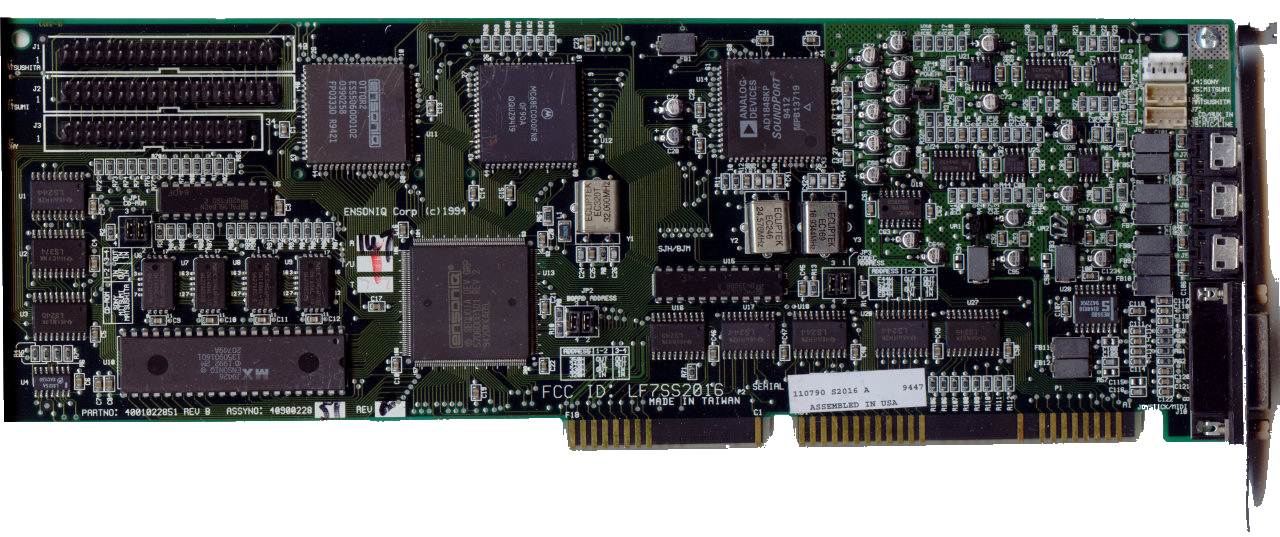 The original Soundscape was Ensoniq's first direct foray into the PC sound card market. It was a full-length ISA digital audio and 'wavetable' sample-based synthesis audio card, equipped with a 2MB Ensoniq-built ROM-based patch set comprising 317 instrument samples.