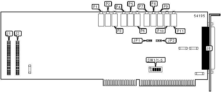 Note: A total of 32 base address settings are available. The switches are a binary representation of the decimal memory addresses. SW1/1 is the Most Significant Bit and jumper SW1/5 is the Least Significant Bit. The jumpers have the following decimal values: SW1/1=512, SW1/2=256, SW1/3=128, SW1/4=64, SW1/5=32. Turn off the switches and add the values of the switches to obtain the correct memory address. (On=1, 0ff=0) | ||||||
