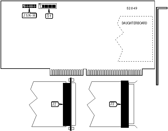 Note:Standard DB-25 serial ports are provided on an included DB-78 adapter cable or 100-pin Centronics breakout box. The serial port connectors J2 and J3 are located on a daughterboard of the main card. Either of the daughterboard cards may be used. The exact size of the daughterboard and the location and type of the daughterboard connectors are unidentified. | |||