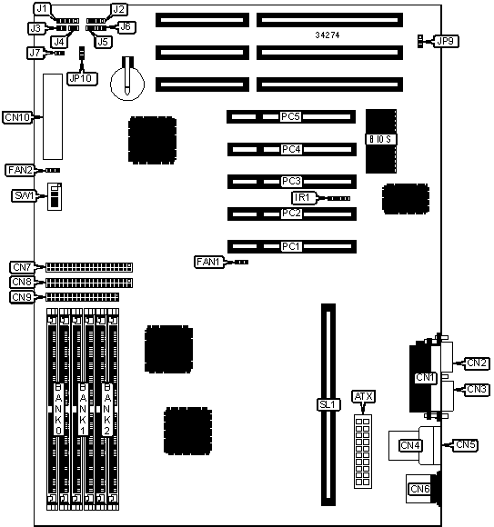 32-bit PCI slots (5), floppy drive interface, green PC connector, IDE interfaces (2), parallel port, PS/2 mouse port, serial ports (2), IR connector, USB connectors (2), ATX power connector, System Management Module, CPU Slot 1 |