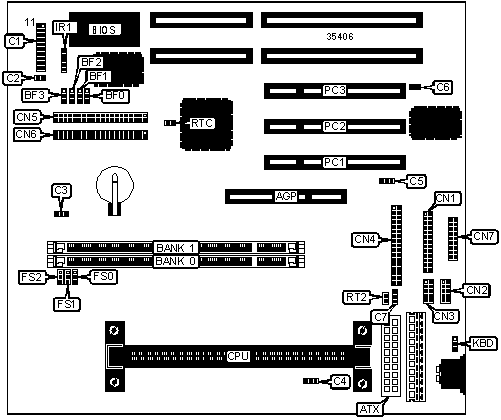 32-bit PCI slots (3), floppy drive interface, green PC connector, IDE interfaces (2), parallel port, PS/2 mouse interface, serial ports (2), IR connectors (2), USB connector, ATX power connector, AGP slot |