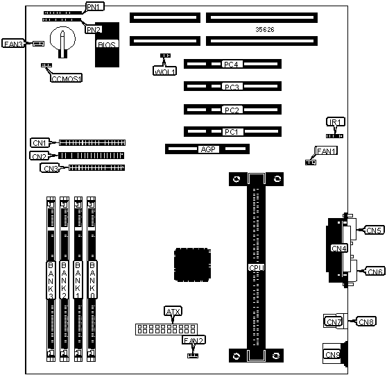 32-bit PCI slots (5), floppy drive interface, IDE interfaces (2), parallel port, PS/2 mouse port, serial ports (2), IR connector, USB connectors (2), ATX power connector, AGP slot, |