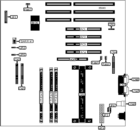 32-bit PCI slots (3), floppy drive interface, IDE interfaces (2), parallel port, PS/2 mouse port, serial ports (2), IR connector, USB connector (2), ATX power connector, AGP slot |
