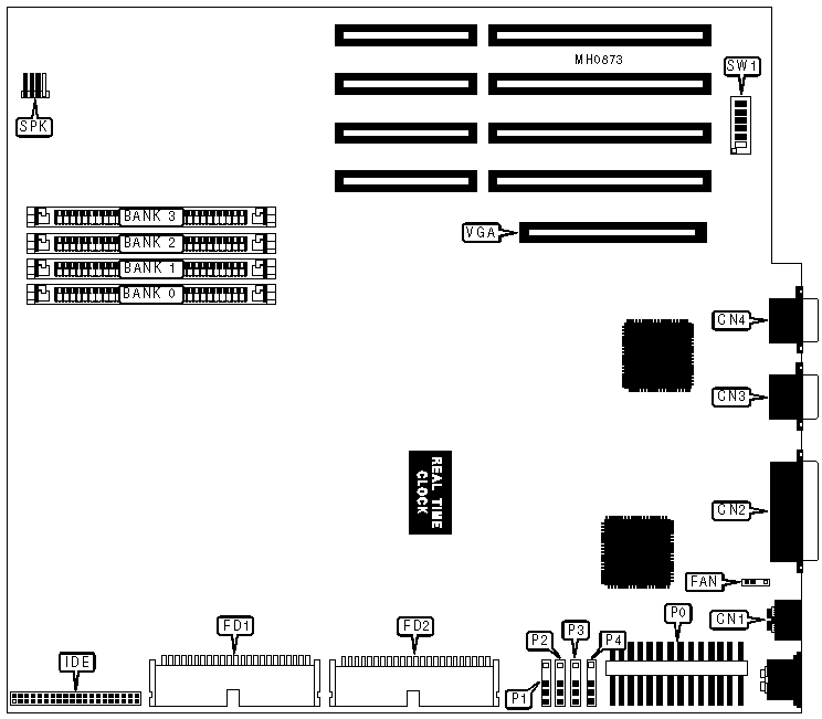 VGA feature connector, floppy drive interface, IDE interface, parallel port, serial port, VGA port, bus mouse