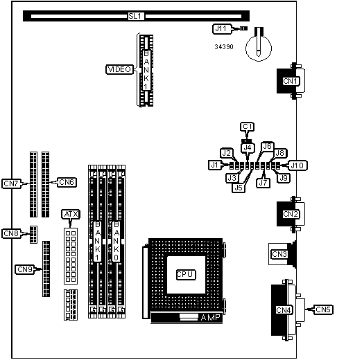 Floppy drive interface, IDE interfaces (2), parallel port, PS/2 mouse port, serial ports (2), VGA port, riser slot, ATX power connector