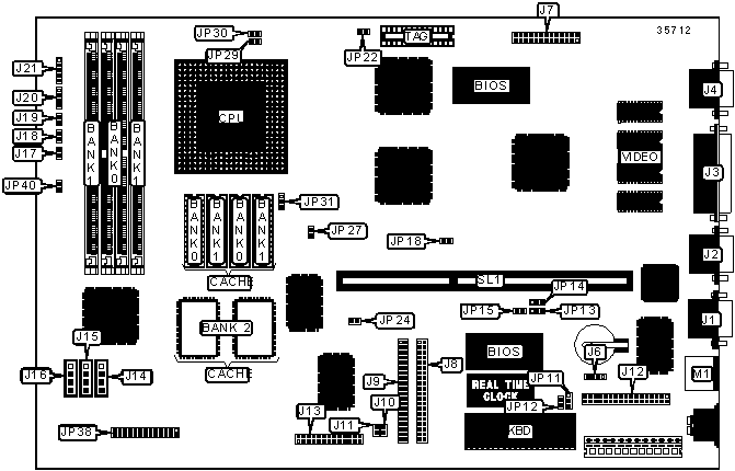 Floppy drive interface, green PC connector, IDE interfaces (2), parallel port, PS/2 mouse port, serial ports (2), VGA feature connector, VGA port, riser slot, wavetable connector, audio in – CD-ROMs (3), MIDI connector