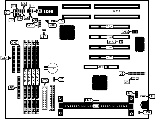 32-bit PCI slots (4), floppy drive interface, green PC connector, IDE interfaces (2), parallel port, PS/2 mouse port, serial ports (2), IR connector, USB connector, ATX power connector, AGP slot |
