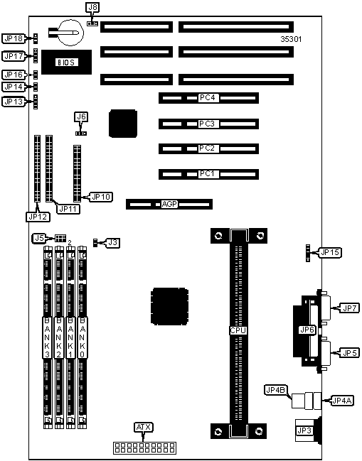32-bit PCI slots (4), floppy drive interface, IDE interfaces (2), parallel port, PS/2 mouse port, serial ports (2), IR connector, USB connectors (2), AGP slot, ATX power connector |