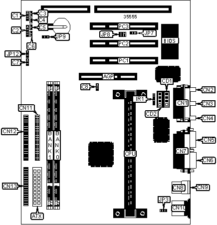32-bit PCI slots (3), floppy drive interface, game/MIDI port, IDE interfaces (2), parallel port, PS/2 mouse port, IR connector, USB connectors (2), ATX power connector, AGP slot, line in, line out, microphone in, SB-link connector, wake on LAN connector
