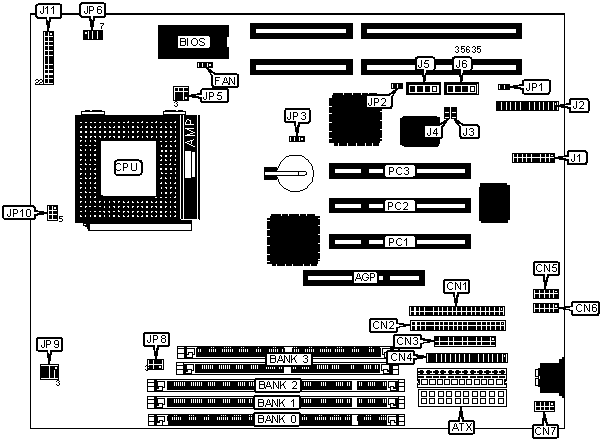 32-bit PCI slots (3), floppy drive interface, IDE interfaces (2), parallel port, PS/2 mouse interface, serial ports (2), IR connector, ATX power connector, AGP slot, audio in – CD-ROMs (2)