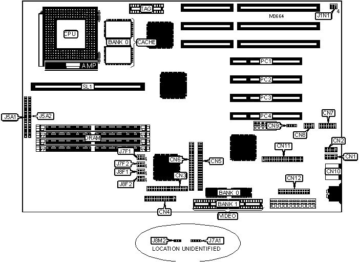 Note: Board accepts EDO memory. The location of banks 0 & 1 are unidentified. Board also accepts x 36 SIMMs.