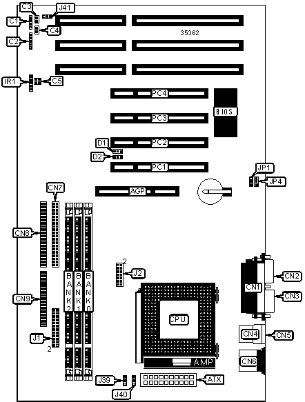 32-bit PCI slots (4), floppy drive interface, IDE interfaces (2), parallel port, PS/2 mouse port, serial ports (2), serial port, IR connector, USB connectors (2), ATX power connector, AGP slot |
