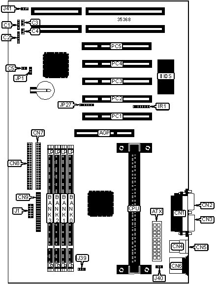 32-bit PCI slots (5), floppy drive interface, IDE interfaces (2), parallel port, PS/2 mouse port, serial ports (2), IR connector, USB connectors (2), ATX power connector, AGP slot |