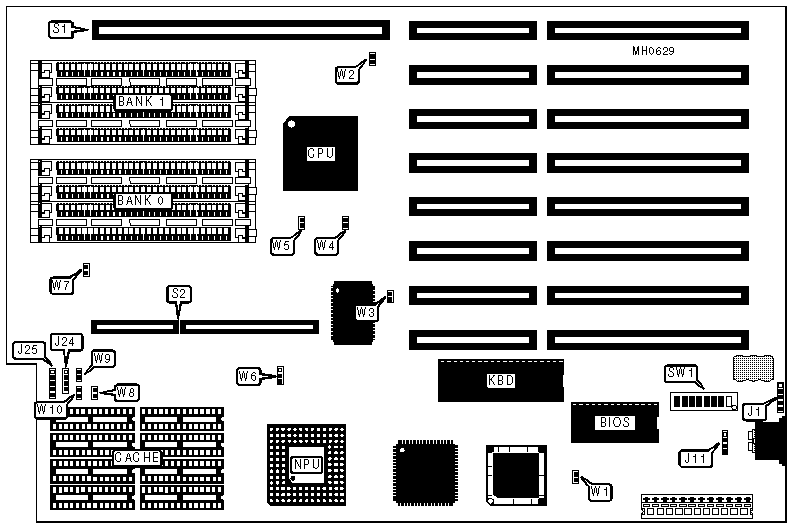 Note 1 :Use this setting when banks are populated with (4) 256K x 9 SIMMs.Note 2 :Use this setting when banks are populated with (4) 1M x 9 SIMMs.Note 3 :Use this setting when banks are populated with (4) 4M x 9 SIMMs. | |||||