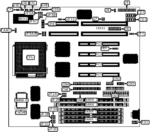 32-bit PCI slots (4), floppy drive interface, IDE interfaces (2), parallel port, PS/2 mouse interface, serial ports (2), IR connector, audio in – CD-ROMs (2), ATX form card connector, digital audio in/out connector, sound/game connector