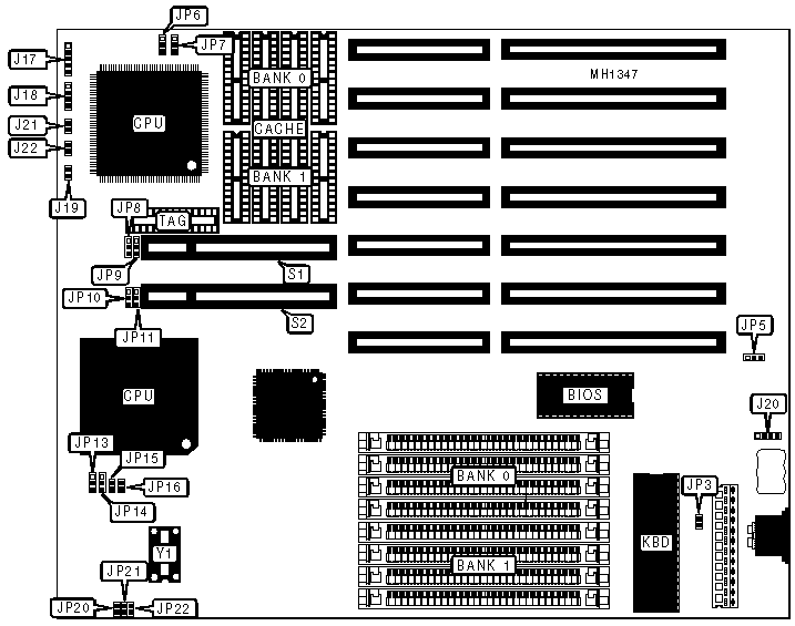 Notes:The board may come with a clock generator at Y1. JP8 controls VESA bus slot S1's speed, JP9 Controls VESA bus slot S1's wait states. JP10 controls VESA bus slot S2's speed, JP11 Controls VESA bus slot S2's wait states. | |||||