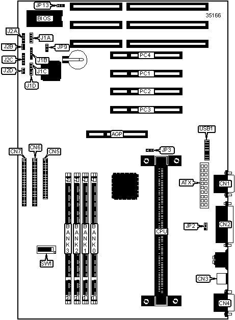 32-bit PCI slots (4), floppy drive interface, IDE interface (2), parallel port, PS/2 mouse port, serial ports (2), USB connector (2), IR connector, AGP slot, green PC connector, ATX power connector |