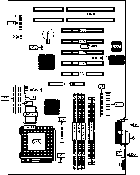 32-bit PCI slots (5), floppy drive interface, IDE interfaces (2), parallel port, PS/2 mouse port, serial ports (2), IR connector, USB connectors (2), ATX power connector, AGP slot