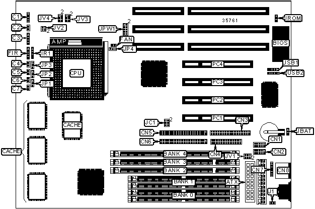 32-bit PCI slots (4), floppy drive interface, IDE interfaces (2), parallel port, PS/2 mouse port, PS/2 mouse interface, serial ports (2), IR connectors (2), VRM connector, USB connector, USB connectors (2), ATX power connector, AGP slot |