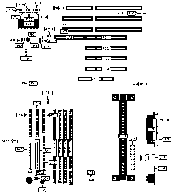 32-bit PCI slots (4), floppy drive interface, IDE interfaces (2), Wide Ultra SCSI interface, Wide SCSI interface (2), parallel port, PS/2 mouse port, serial ports (2), IR connector, USB connectors (2), ATX power connector, AGP slot |