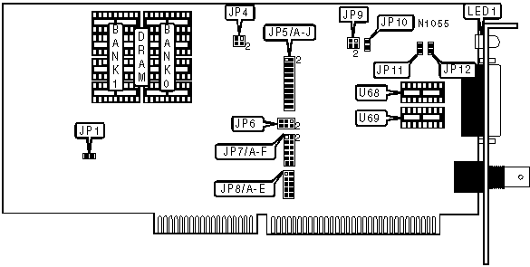 Note: A total of 1023 base I/O address settings are available. The jumpers are a binary representation of the hexadecimal base I/O addresses. Jumper JP5/J is the Least Significant Bit and jumper JP5/A is the Most Significant Bit. The jumpers have the following hexadecimal values: jumper JP5/J=4000h, JP5/I=8000h, JP5/H=10000h, JP5/G=20000h, JP5/F=40000h, JP5/E=80000h, JP5/D100000h, JP5/C=200000h, JP5/B=400000h, JP5/A=800000h. Open the jumpers and add the values of the open jumpers to obtain the correct base I/O address. (closed=0, open=1) | ||||||||||