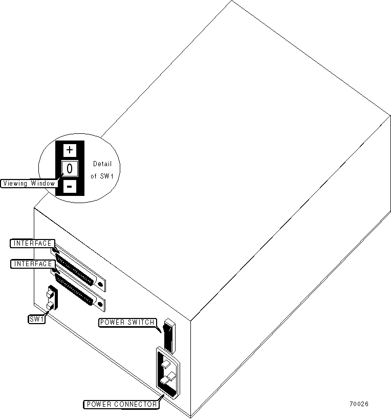 Note: SCSI ID is selected by activating SW1 until the desired number is displayed in the viewing window. Press the (+) button to select a higher ID, press the (-) button to select a lower ID. |