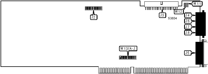 Note: A total of 1023 base address settings are available. The jumpers are a binary representation of the decimal memory addresses. W13/A is the Most Significant Bit and jumper W13/J is the Least Significant Bit. The jumpers have the following decimal values: W13/A=512, W13/B=256, W13/C=128, W13/D=64, W13/E=32, W13/F=16, W13/G=8, W13/H=4, W13/I=2, W13/J=1. Open the jumpers and add the values of the open jumpers to obtain the correct memory address. (Open=1, Closed=0) | |||||||||||