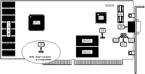 Note: This card may take 256KB, 512KB, or 1MB of on-board DRAM. The locations of the banks and the configurations of the chips in these banks is unidentified. |