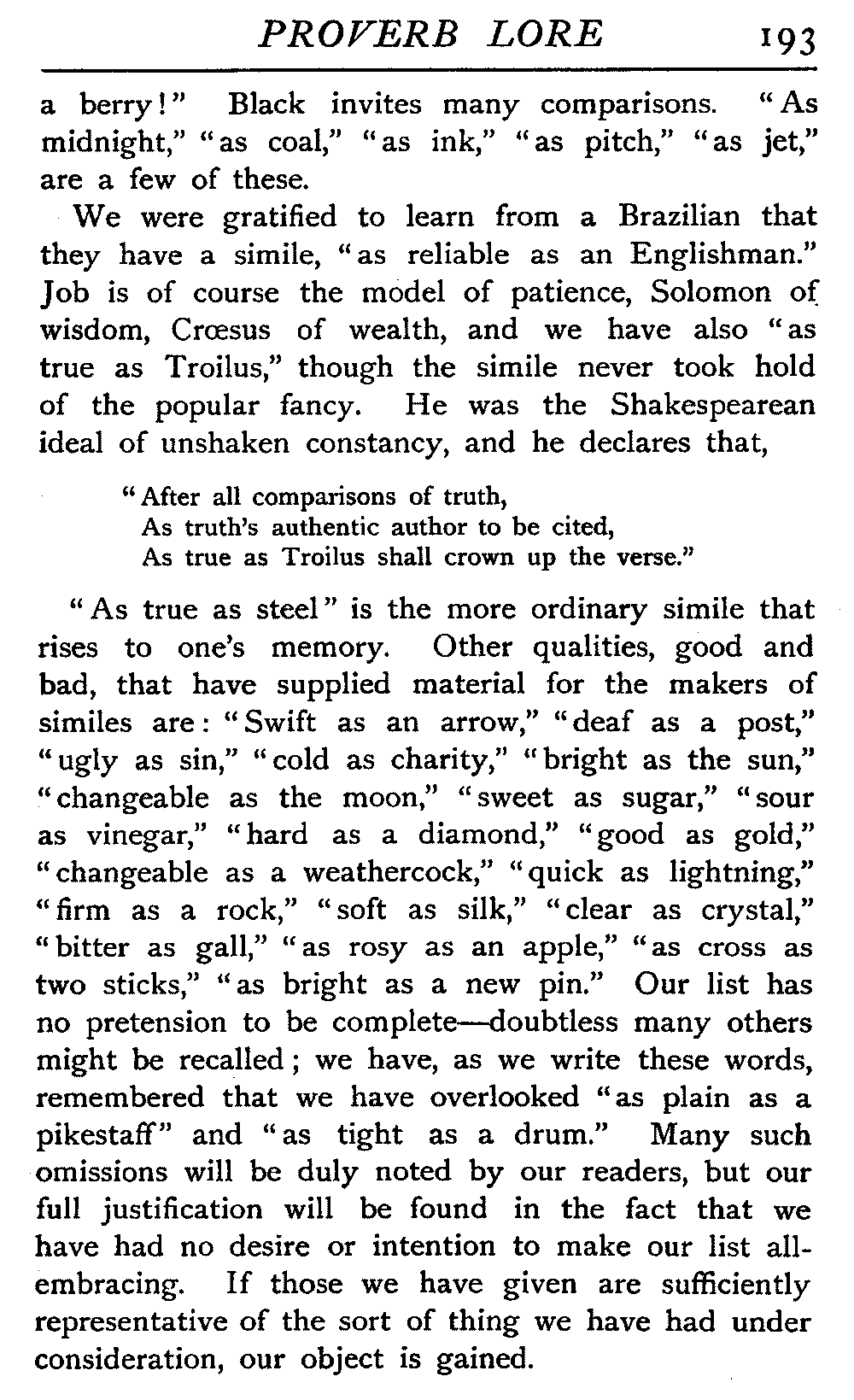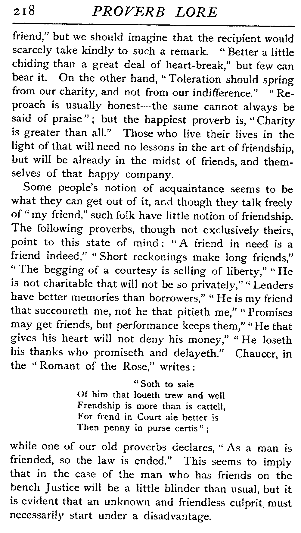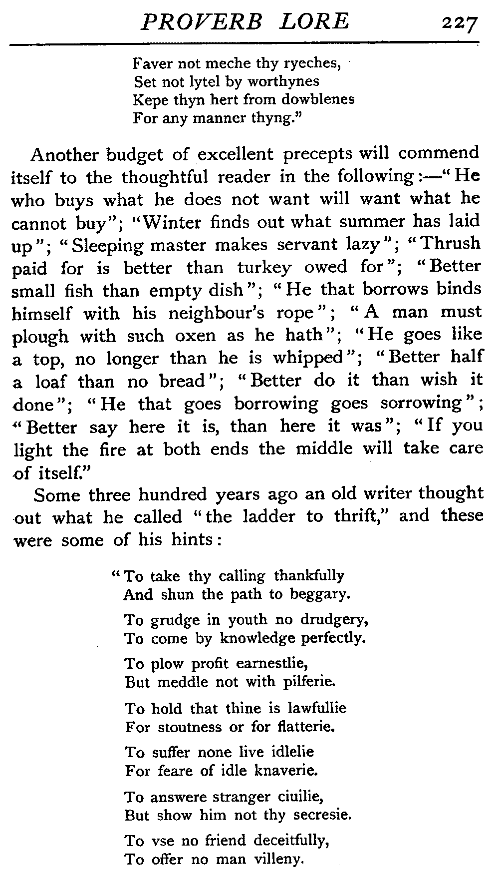 | The Power of the Tongue—Speech and Silence—Knowledge and Wisdom not Interchangeable Terms—Truth and Untruth—Travellers' Tales—Flattery—Industry and Sloth—Youth—Friends, True and False—Riches and Poverty—The Ladder to Thrift—The Influence of Womankind—The Good Wife—The Shrew—The Testimony of Epitaphs—The Grey Mare—Home—Hope—Forethought—Excuses—Good and Ill Fortune—Retribution—Detraction—Pretension—Self-interest—Bribery and Corruption—Custom and Habit—The general Conduct of Life—The Weather—The Moon made of Green Cheese—Conclusion | 194 |
