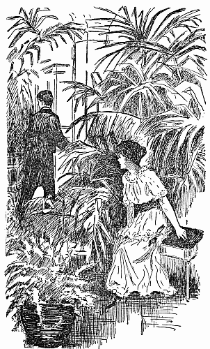 With a murmured exclamation the girl dropped down on a low stool in the corner where the evergreens almost entirely concealed her and where she appeared more like an elf creature that had come into the house with the green things surrounding her than an everyday girl. For a quarter of an hour she must have remained[11] there alone, when she was aroused from her reverie by some one's entrance. Then, although the girl did not move or speak, her whole face changed and the sullen, unhappy look disappeared, while oddly her eyes filled with tears.