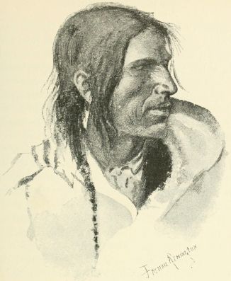 Mr. Remington was anxious to paint Old Sun and his squaw, particularly the latter, and he easily obtained permission, although when the time for the mysterious ordeal arrived next day the old chief was greatly troubled in his superstitious old brain lest some mischief would befall him through the medium of the painting. To the Indian mind the sun, which they worship, has magical, even devilish, powers, and Old Sun developed a fear that the orb of day might "work on his picture" and cause him to die. Fortunately I found in Mr. L'Hereux, the interpreter, a person who had undergone the process without dire consequences, was willing to undergo it again, and who added that his father and mother had submitted to the operation, and yet had lived to a yellow old age. When Old Sun [24]brought his wife to sit for her portrait I put all etiquette to shame in staring at her, as you will all the more readily believe when you know something of her history.