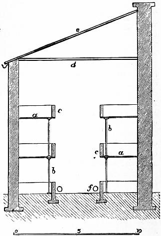 Water Supply.—Although water is one of the most important elements in plant life, we do not find one garden in twenty where even ordinary precautions have been taken to secure a competent supply. Rain-water is the best, next to that river or pond water, and last of all that from springs; but a chemical analysis should be made of the last before introducing it, as some spring waters contain mineral ingredients injurious to vegetation. Iron pipes are the best conductors; they should lead to a capacious open reservoir placed outside the garden, and at the highest convenient level, in order to secure sufficient pressure for effective distribution, and so that the wall trees also may be effectually washed. Stand-pipes should be placed at intervals beside the walks and in other convenient places, from which water may at all times be drawn; and to which a garden hose can be attached, so as to permit of the whole garden being readily watered. The mains should be placed under the walks for safety, and also that they may be easily reached when repairs are required. Pipes should also be laid having a connexion with all the various greenhouses and forcing-houses, each of which should be provided with a cistern for aerating the daily supplies. In fact, every part of the garden, including the working sheds and offices, should have water supplied without stint.