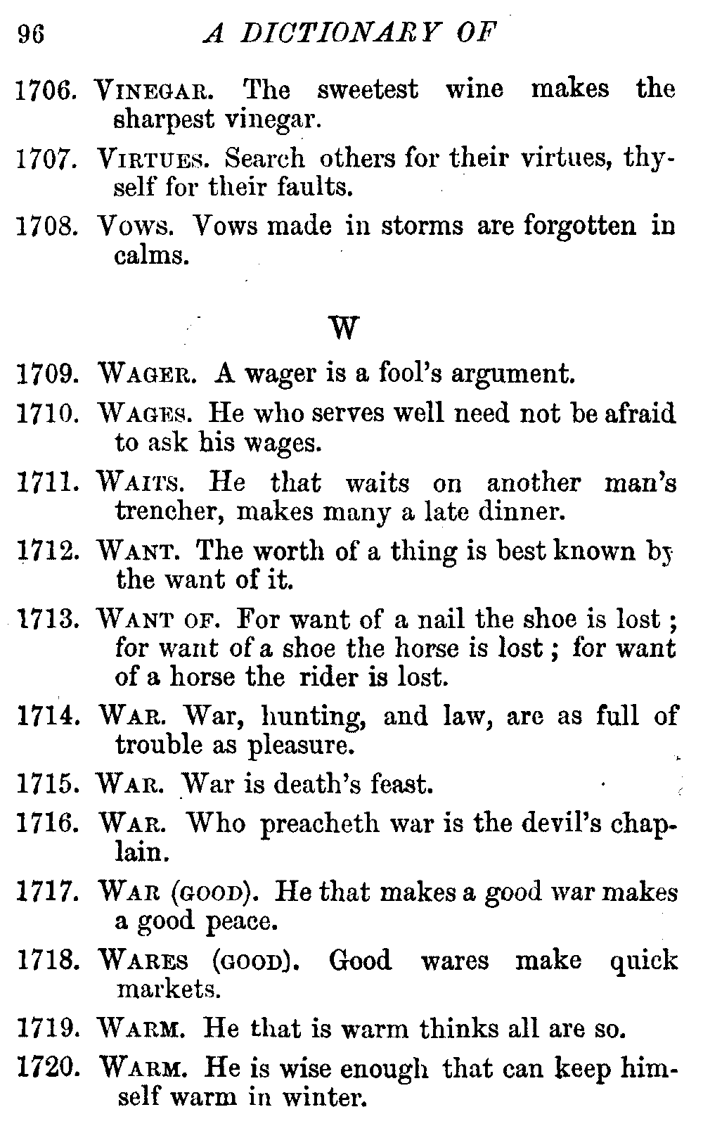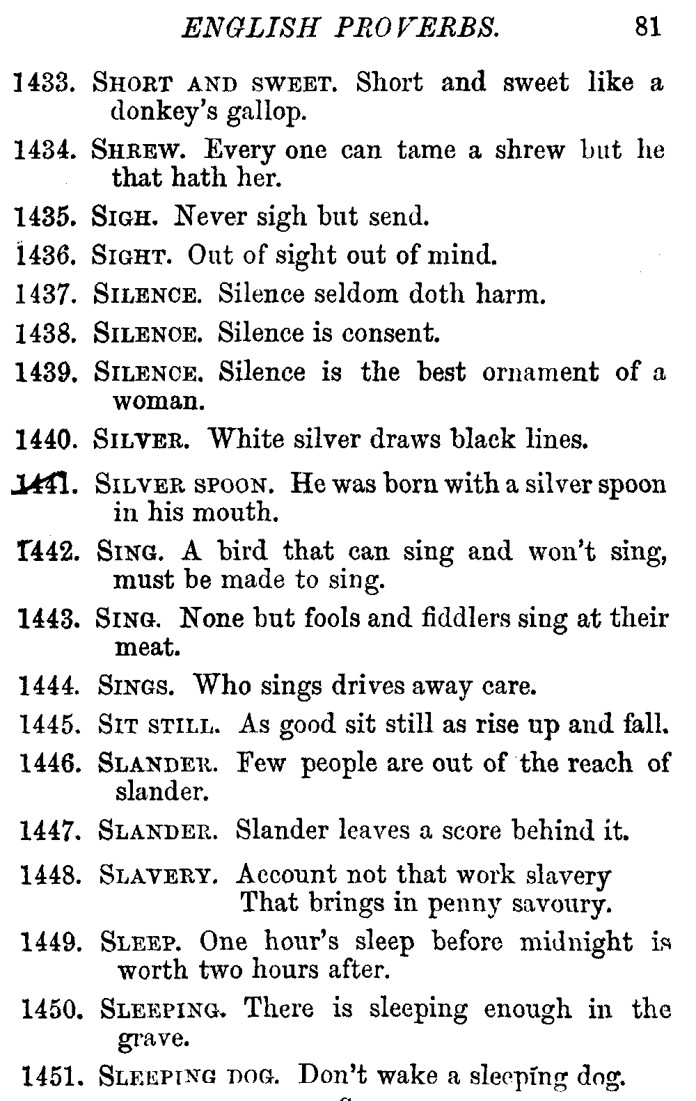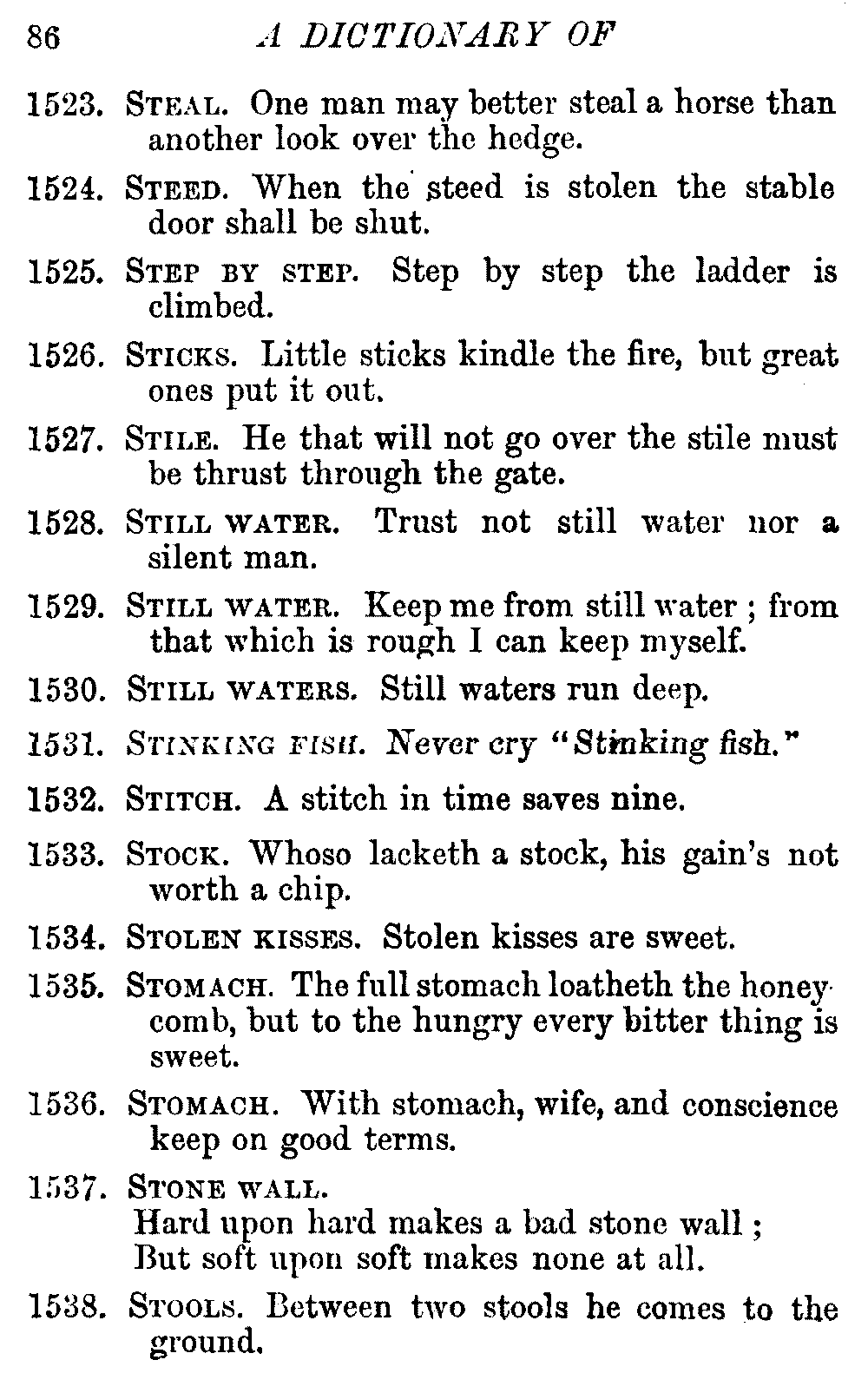 Other modern collections profess to give an "Alphabetical Index," but such an index is of little use when we find that it is framed on the rule that because a proverb begins with the article A, it should therefore be indexed under that letter. As, "A bald head is soon shaven." In another similar Index we find the proverb, "'Tis the second blow makes the fray," inserted under the letter T. In one index of this kind there are no less than twenty-two pages of A's [vii]and almost as many of The's. Indeed the whole index is compiled without the slightest regard to the subject of the proverbs. On this subject Disraeli, in his essay on the "Philosophy of Proverbs," says "The arrangement of proverbs has baffled the ingenuity of every one of their collectors. Ray, after long premeditation, has chosen a system with the appearance of an alphabetical order, but it turns out that his system is no system, and his alphabet is no alphabet. After ten years' labour the good man could only arrange his proverbs by commonplaces." In this little Dictionary, as we have already stated, the proverbs are arranged in alphabetical order, according to the leading words, and are consecutively numbered. But, in order to avoid repetition (as most of the proverbs contain, at least, two leading words), the subject words are used for the Dictionary, and the other principal words will be found in the Index, with a numerical reference to the proverb. The great advantage of this arrangement is, that if only one important word of a proverb be remembered, that word can be turned to in the Dictionary, and, if not found there, will certainly be in the Index. Nearly two thousand of the leading words are thus indexed—enough to make it almost impossible to miss finding what is wanted. This plan has also the effect [viii]of bringing together the proverbs on kindred subjects, which is often a matter of importance to writers, and is, moreover, most amusing to those who only read the book to while away a leisure hour. Ready reference is further facilitated in the Index by the addition of associated words. If one word only had been given, the reader might have had to refer to eleven proverbs before he found the one he required; as, for example, in the case of Dog.