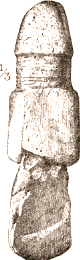 Fig. 158c (No. 89455 [929] from Nuwŭk), is 5.9 inches long. The eye is drilled lengthwise through a large lump projecting from the middle of one side. Small blue beads are inlaid for the eyes, and one to indicate the male genital opening.