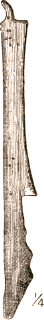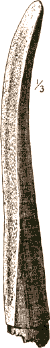 Fig. 313 (No. 89461 [1279] from Utkiavwĭñ) represents a little implement which we never saw in use, but which we were told was intended for scraping the scales off a fish. The specimen does not appear to be newly made. It is a piece of hollow “long” bone, 8 inches long, cut into the shape of the blade of a case knife, flat on one face with a broad, shallow, longitudinal groove on the other.